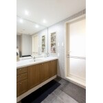 既存のオーク系の洗面台に合わせてタイル調の壁紙とダークグレーのクッションフロアでモダンな洗面所になりました。