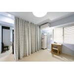 2部屋がワンスペースになった寝室は、天井の中央部分にカーテンレールを設置し、カーテンで間仕切りできるようにしてあります。 将来的に間仕切り開閉壁などで、2部屋に区切ることも視野に入れたご提案です。