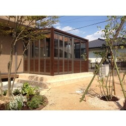 門周りは樹木の種類と配置を変え、樹脂製のフェンスを設けすっきりとした印象に。お庭のメインはガーデンルームを設置し、洗濯物干しや家族団欒のスペースになります。勝手口側には前面パネル付きのテラス屋根を設置。自転車やゴミ箱を収納できます。家族・友人と笑顔あふれる空間になりました。