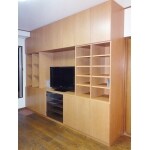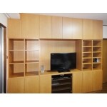 既存の天井高や梁に合わせて完全オーダーの壁面収納を造作しました。 ダイニングテーブルにてテレビを見ることもあり、テレビ高さは通常より高めで設計いたしました。 たっぷりの収納で既存の造作家具にも調和しており、とても喜んでいただきました。