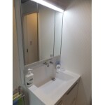 洗面化粧台は少し小さめでした。 今回設置場所を替え、TOTO オクターブW750にお取替えしました。 3面鏡になったことで細かいものもスッキリ収納できるようになりました。 オクターブは壁からの水栓で水栓まわりに水垢が溜まらずお掃除がしやすいのが人気です。