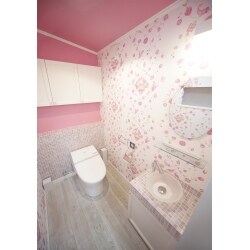 鮮やかなピンクと女性らしい小花柄のクロスが特徴のレストルームです。