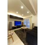 キッチン周りをアールのカウンターで仕上げて、少しでもリビングを広くしました。間接照明を使ってすっきりと。音響もこだわり、スピーカーをリビングを囲むように設置。映画も臨場感溢れて楽しめます。