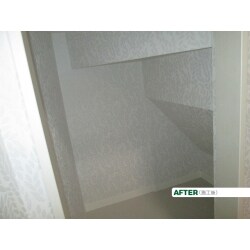 現状の壁材の状態がしっかりしていたため、現状の壁上に下地処理をし、クロス仕上げとしました。「白ベースにしたい」との要望のため、枠材・巾木・床を全て白系の材料にしました。