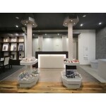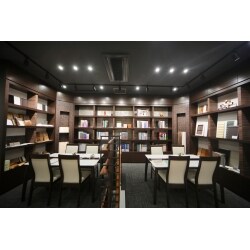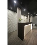 めずらしい凹凸模様のタイルが目を引くラグジュアリーな受付スペースに、ダークトーンの木調が落ち着いた雰囲気を醸し出す商談スペース。 統一感のあるナチュラルモダンなショールームに仕上げました。