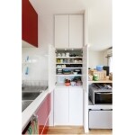 食器棚をどこに置く?という課題がでたため、スッキリ納まる場所に造作してしまいました。お客様がどうしても使いたかった壁紙を、扉の内部にこっそりとあしらっています。