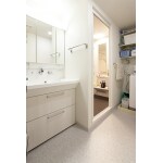 洗面化粧台の扉カラーや壁紙、床材をホワイトカラーでそろえることで、清潔感のある洗面室を実現しました。