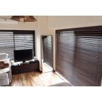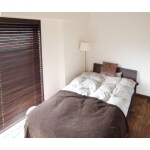 寝室には木製ブラインドを取付。ブラウンの色合いにあわせた無垢フローリングとインテリアでシックな雰囲気に仕上がっています。