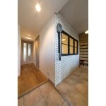 無垢と珪藻土の室内に、回遊できる間取り、タイルと造作家具で温かみで、大好きなものに囲まれた空間に。お子様のことやサイクリングのことなどきいて、玄関横に土間スペース。壁には汚れ防止の黒目時の可愛いタイル。収納はタモで仕上げて、ご夫妻の落ち着くナチュラルに