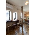 壁を取り払い拡げたリビング。古材カウンターやアンティーク無垢フローリングと珪藻土の優しい壁。 大勢が囲める10人掛けのテーブルも造作。 残す柱には耐震金具を取り付け。 和室は茶室に。黒の塗り壁と赤襖でシックに。スイッチまで黒にこだわりました。