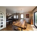 壁を取り払い拡げたリビング。古材カウンターやアンティーク無垢フローリングと珪藻土の優しい壁。 大勢が囲める10人掛けのテーブルも造作。 残す柱には耐震金具を取り付け。