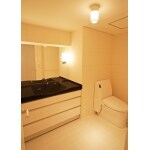 人が横に並んでも使える横長の大きな鏡を設置。使い勝手の良い広々とした洗面スペースとあわせて、トイレも設置いたしました。洗面カウンターの黒がシンプルな空間によく映えます。