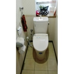 ご高齢のお客様にも、お手入れが簡単なLIXIL のフチレストイレ(シャワー機能付き)をおすすめし、お取替えいたしました。フチレス形状でお掃除も簡単、節水タイプ(5L)のトイレです。