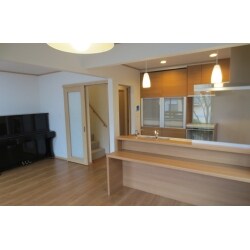 思い切って2つの部屋を1つのリビングにリノベーションいたしました。 キッチンはお客様一目惚れの「リシェル・カウンターキッチン」を選定。照明はLEDのダウンライトを選定し、なんと調光ができます。晩酌タイムは少し雰囲気を出して、まるでBARに居るかの様な素敵な空間が作れます。また、お部屋の印象が暗くなりすぎないように、全体的に明るいお色を選定しました。 あまりの変わり様にお客様もびっくりされましたが、家事に忙しい奥様とも会話がしやすい!と大変喜んでいただけました。