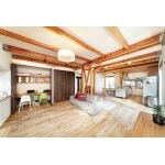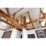 壁や天井をなくして、構造材はすべて洗いをかけて、蜜蝋ワックスで仕上げて使用。木と鉄が醸し出すダイナミックな力強さとオーク無垢フローリングが創る、ぬくもりある空間に。