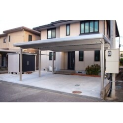 家の顔ともなる玄関周りの外構工事をさせていただきました。全面土間コンクリートを打ち、2台用のカーポートを新設、物置を新しく入替えました。 施主様からのご要望でガーデニングができるように、玄関前の階段横には赤いレンガを積み、プチ花壇を作りました。大事なお車を雨や日差しからしっかりとお守りする快適で広々とした駐車スペースに仕上がりました。