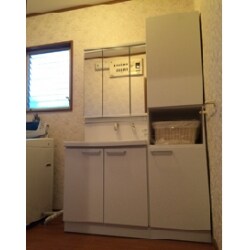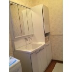 収納ランドリーはキャビネットタイプにすることで全部収納できるのですっきりした洗面所に。