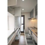 限られたスペースの中で収納にお困りであるとのことでしたので、コンパクトで使い勝手のよいTOTOのCJシリーズと収納キャビネットをご提案させて頂きました。 吊り戸収納は乾燥機能付きの電動タイプで、食器の出し入れもラクラクなうえに、清潔にお使いいただけます。