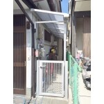 (旧京都建物株式会社(京都建物工務店リフォーム)での事例です。)アプローチ部分の古くなったテラス屋根も交換させていただきました。ナチュラルシルバー色で門扉付きなので見た目良く、防犯対策もばっちりです。