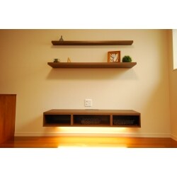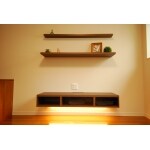 (旧京都建物株式会社(京都建物工務店リフォーム)での事例です。)壁面に取り付けるシステム造作棚をご提案。テレビ台の下には必要なものを収納するスペースを確保しました。上部の一枚棚にはお気に入りのものを飾っていただき、見せるスペースとしてご提案させていただきました。