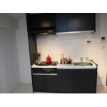 シンプルなI型キッチンで部屋の雰囲気に合わせてシックな色味に変更しました。