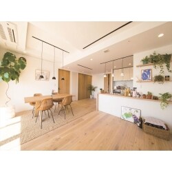 新築マンションをご購入されたH様。建具の色や内装をより自分好みにしたいとリフォームをご検討されていました。 リビングの隣の洋室との壁を撤去し、広々としたリビングに。キッチンからもリビングの様子がわかるようにしました。 また建具やフローリングがこげ茶の落ち着いた雰囲気でしたが、明るめの色の無垢フローリングに張替え、ナチュラルで明るい雰囲気に変更しました。