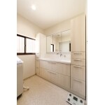 天井・壁を全てクロス貼りに変更、床は固く冷たいタイルでしたので、弾力のあるクッションフロアへの貼替をご提案致しました。 もともと十分な収納が確保できずに納まりきらなかった日用品なども、大容量の洗面化粧台に取り替えたことで洗面室全体の見た目もスッキリ!