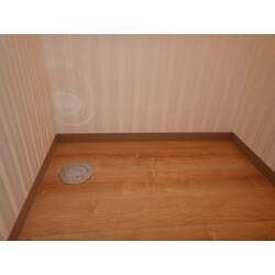小便器撤去後、給排水処理の漏れがないか確認します。 トイレ内部の床及び内壁タイルの上にボードを張っていきます。 清潔感のある納戸になりました。