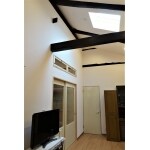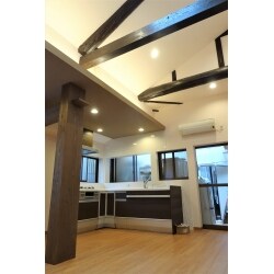 天井を取り払い、古い梁を見せた開放感のある空間に。 天窓も付けて明るいダイニングキッチンに。