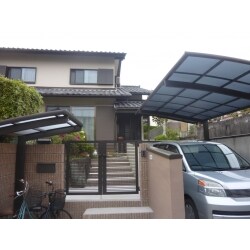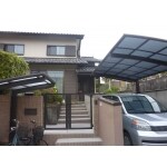 元々あった駐車場の屋根も取り除きさらに斜めに壁を落とす事で、広く感じ易いように細工し階段は1つ段数を増やし、高さを揃えました。カーポート・自転車ポートは建物と色合いを合わせたLIXIL様の商品を採用。