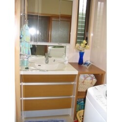 奥様が木質系がお好きなので、扉は木目調を採用し、収納も容量のできるだけ大きい物で提案し、余ったスペースは木工事で造作棚を作りました。