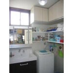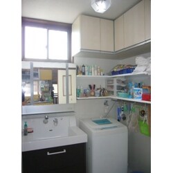 無駄なく収納できるようにL型に棚を造作。棚の下にはポールを取り付けて、バスマットやS字フックで簡単収納。壁や床も汚れをふき取りやすい素材の物でお手入れを簡単に出来るようにしました。