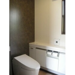 広さを十分にあるので、自動開閉他多機能のタンクレストイレを取り付け、サイドに収納量も十分なキャビネットを設け、壁はサニタリーパネルを貼り汚れにくくしました。