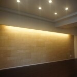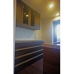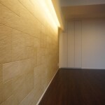キッチンのカップボードをオーダー製作したので、冷蔵庫スペースを空けて、間口ピッタリに納めました。 また、リビングは全面真っ白のクロスで、少し寂しい感じだったので、1面のみアクセントを付け、間接照明を入れることで明るさを確保。 インテリアとして楽しめる壁面としました。