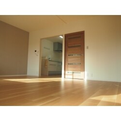フローリングは明るめに。太陽の光が入ってあたたかみのある空間になりました。また、リビングドアの色を床より少し濃い色にすることで、落ち着いた優しい雰囲気のお部屋に。明るいグレーの壁紙が良いアクセントになって、お部屋にまとまりができました。