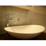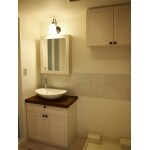 一番こだわった洗面所。無垢のキャビネットとこだわりのボール水栓を取り付けました。白い空間の中に、洗面台カウンターの茶色がアクセントで映えています。 壁にはヨーロッパ製のタイルを貼りました。タイルの並びはお客様に決めて頂きました。とても素敵です。