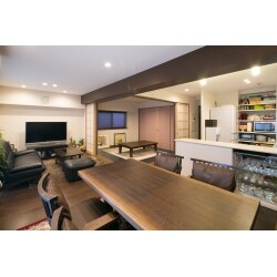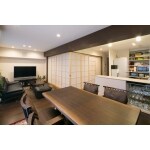 和室の壁を撤去し、コーナー3枚引戸にすることで、LDK全体が明るく開放的になりました。すっきりとしたダウンライトがさらに空間に拡がりを持たせ、深みのあるダルブラウンの床や建具が落ち着いた雰囲気を作ります。
