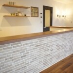 タイル調の床とスモーキーグリーンのキッチンが、おしゃれな空間を演出しています。 キッチンカウンターの壁には天然石のタイルを埋め込み、まるでカフェのような雰囲気に。