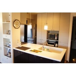 キッチンとリビングの間にある壁を取り除き、開放的で対面式のキッチンにされたいとのご要望でした。奥様が思い描いているキッチンをお打ち合わせをさせて頂く中で知ることが出来、私たち自身もわくわくしていました。工事が始まってから作り付けの家具、L型のキッチン、カウンターに合わせた壁を造作してきちんと納まるか心配でしたが、きれいに納めることができました。