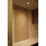 玄関収納上とミラー両側にエコカラットを貼りアクセントを。色味はベージュを選び、質感でメリハリをつけました。
