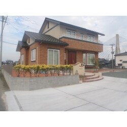 お仕事用のお車やご家族のお車を多く停めれる様、駐車場はコンクリートと砕石で仕上げさせて頂きました。M様が敷かれた赤い砂利がとても目立っております。