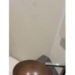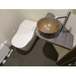 お客様も利用されるトイレですので、デザインと機能を併せ持った空間に変身しました。 ジャパニーズモダンをモチーフに畳風の床材、陶器の手洗い、鉄平石を思わせるメラミンカウンター、塗壁風のクロス、と随所にこだわりあるデザインをご提案いたしました。