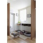 2つの住居を一体化させた住まいのため、サブの玄関が存在します。 こちらをあえて撤去せずに残し、愛犬2匹がまったりと過ごすドッグスペースにしました。 エリアを仕切る程度の間仕切り(スリット格子)を採用し、どこにいても大切なペットの様子が窺えるようになりました。