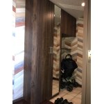 床から天井までのトールキャビネットにしたので収納力は抜群によくなりました。 姿見を扉に取り付けました。
