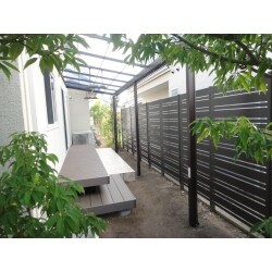 植栽の位置には、板幅を変えた木目のフェンスを取り付け、既存のパーゴラを木目のテラス屋根に。既存のタイルテラスを活かしたカタチでのウッドデッキを設置しています。洗濯物を干すときやお庭への出入りがしやすくなり、統一感のあるブラウン色でグッと高級感のある空間になりました。