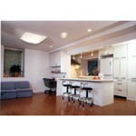 (旧東京ガスリモデリング株式会社での事例です。)著名な建築家の設計したお宅という事もあって、改装のポイントの絞り込みに苦労しました。L.D.はコンクリートの低い壁によって仕切られ、キッチンは独立型でしたが、南北の狭さを、南側の庭に対してアイランド型とすることにより広がりをもたせ、東西へは玄関ホールも部屋の一部としてとり込める様に、収納家具以外はできるだけガラスでデザインしました。