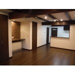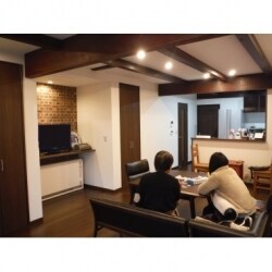 リビングが家族のくつろぎの場となるようにLDKをお家の中心となるように計画しました。 築50年を超える古民家で1階の階高が低い為、2階床梁をそのまま生かし古き良き味わいを趣豊かに甦らせました。レンガ調のアクセントクロスが違和感なく調和しモダンなリビングとして仕上がっております。