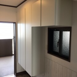 今までの玄関の収納を撤去して 上に取り付ける収納BOXを設置。 必要な分だけ収納BOXを設置する事で すっきりとした玄関になりました。 また、白を基調とした玄関となり やわらかい印象でより広く感じる雰囲気と なりました。