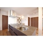 キッチン施主様支給。独立していたキッチンをダイニング・リビングとつなげ一体化させました。オープンキッチンで開放的な印象に。キッチン背面には収納棚を設置。引き戸を閉めれば目隠しになります。