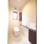 便器、手洗い器施主様支給。タンクレスの便器と、別で手洗い器を設置。消臭、調湿に優れたエコカラットを施工し、ゆとりのある広さのトイレです。